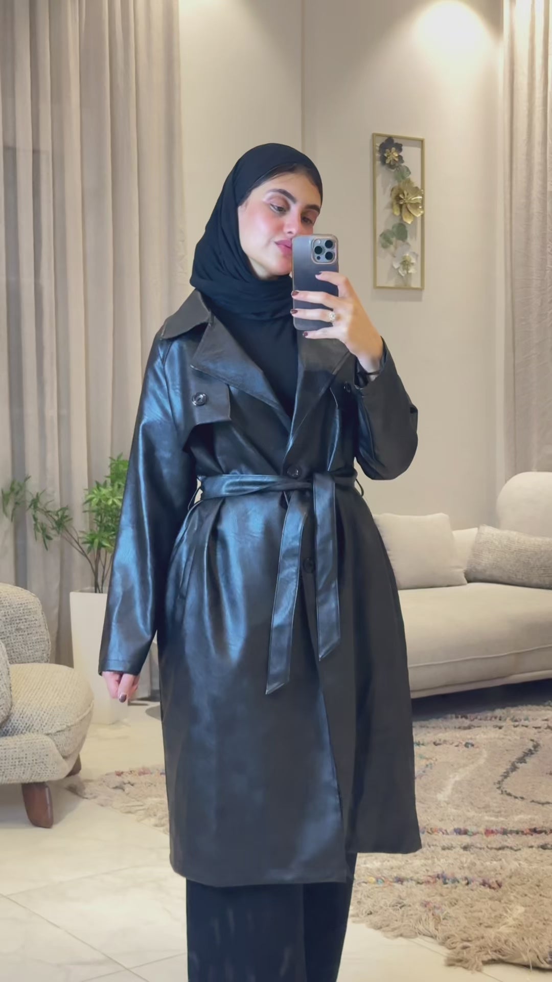 Long leather coat available in three colors — elegant, comfy, and easy to style.