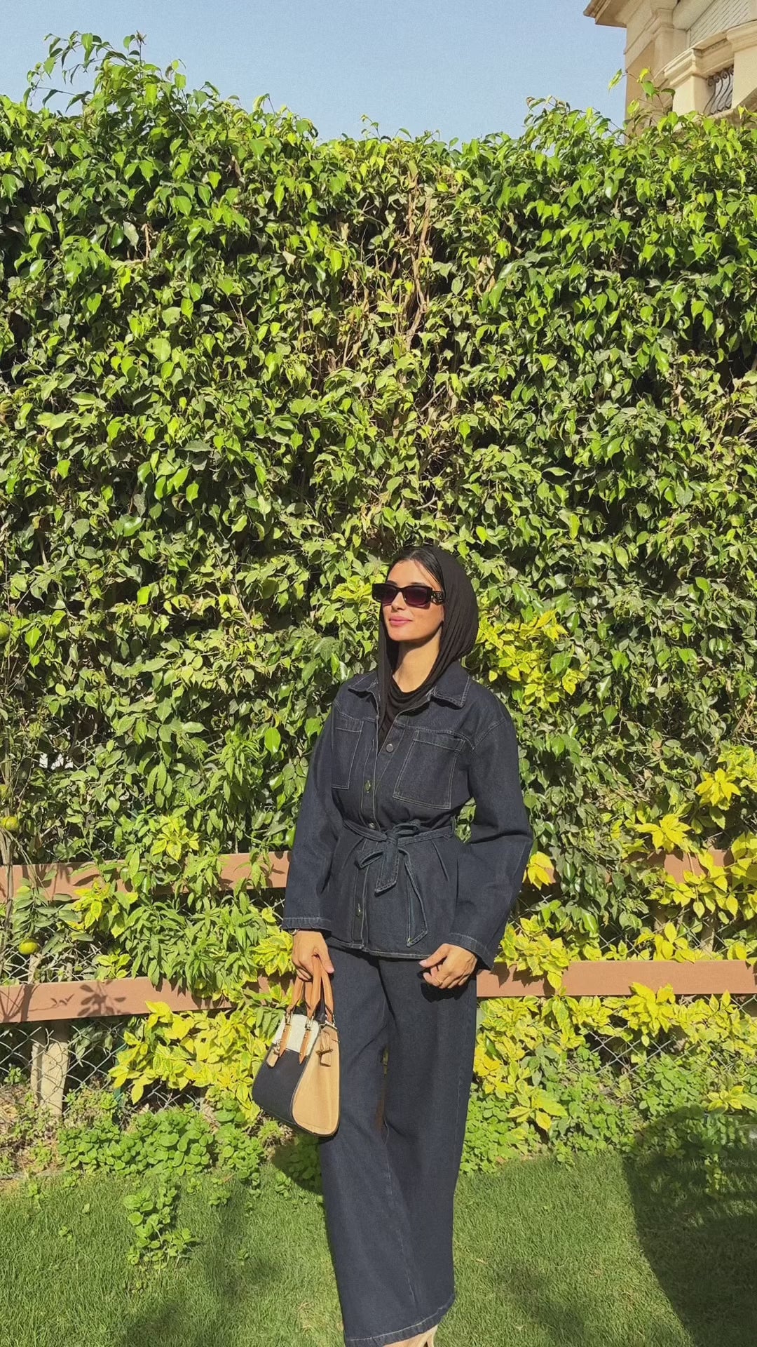 A chic denim suit featuring a matching shirt and straight-cut jeans, completed with a coordinating belt for a defined, polished look. Perfect for effortless everyday style.